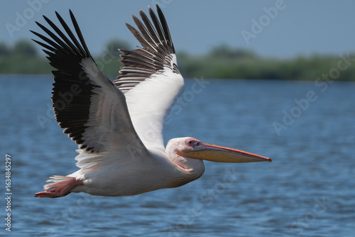 Great White Pelican - Pelecanus onocrotalus with spanned wings in flight over blue water of Danube Delta in Romania.