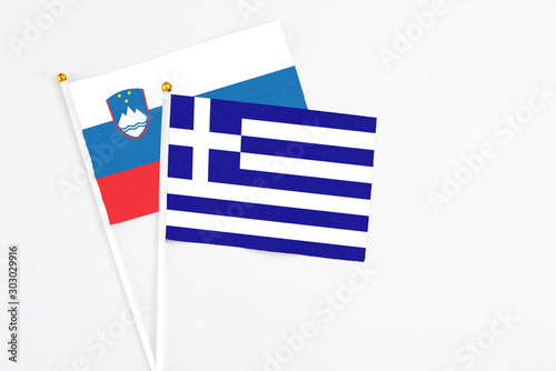 Greece and Slovenia stick flags on white background. High quality fabric, miniature national flag. Peaceful global concept.White floor for copy space.