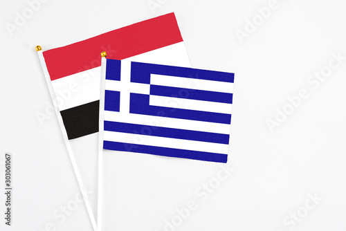Greece and Yemen stick flags on white background. High quality fabric, miniature national flag. Peaceful global concept.White floor for copy space.