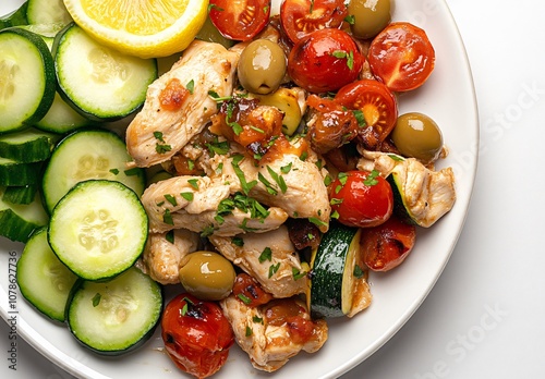 greek, chicken, courgette, tomatoes, olive, cucumber, lemon, plate, food, photo, delicious, minimalist, clean, professional, lighting, hi-res, natural, shadow, vibrant, cinematic, presentation, topview, white background, fresh, healthy, mediterranean, dinner, lunch, receipe, side dish, greek salad