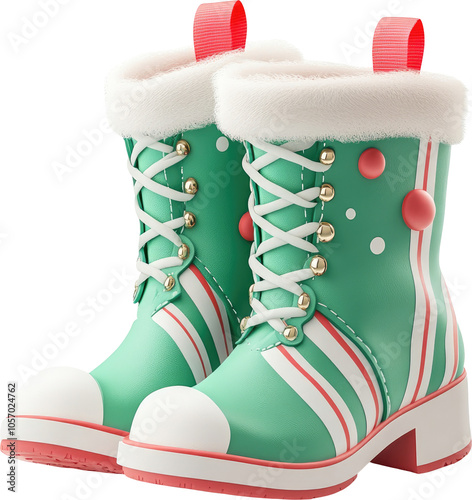 Green and Red Striped Boots with White Fur Trim Isolated on Transparent Background.
