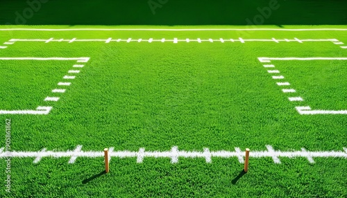 Green artificial turf football field with yard lines and end zones, yellow, game