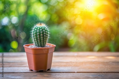 Green cactus in plastic pot on wooden table under afternoon sun