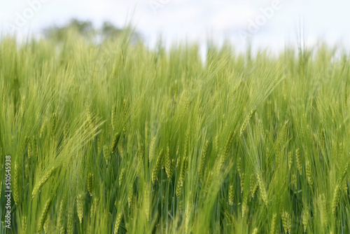 Green cereal field at spring with ripening ears of wheat. Selective focus. Low DOF
