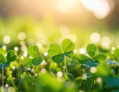clover, shamrock, dew, green, luck, lucky, leaf, nature, plant, closeup, spring, morning, grass, field, growth, fresh, drop, dew-drop, sunlight, bright, vibrant, background, bokeh, outdoors, season, closeup, macro, detail, flora, symbolic, symbol, auspicious