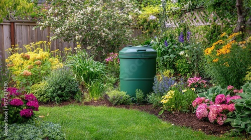 Green Compost Bin in a Vibrant Backyard Garden Surrounded by Flowers