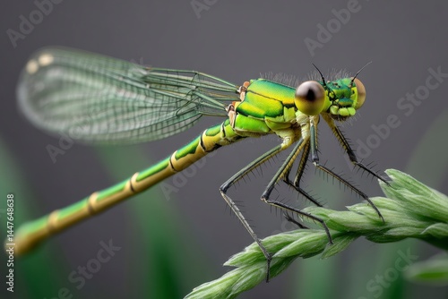 damselfly, resting, macro, closeup, detailed, nature, outdoors, still, grey, green, plant, leaf, wing, eye, leg, abdomen, pattern, texture, sharpened, wildlife, background, day, summer, spring, insect, animal, fauna, flora, stalk, grass, bug, wild, camouflage, observation