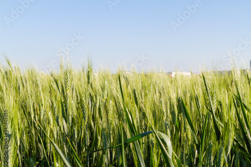 landscape, nature, green, wheat, agriculture, field, rural, countryside, land, grass, plant, sky, farm, growth, sun, crop, natural, spring, country, summer, background, season, cloud, meadow, farming, sunset, blue, sunlight, horizon
