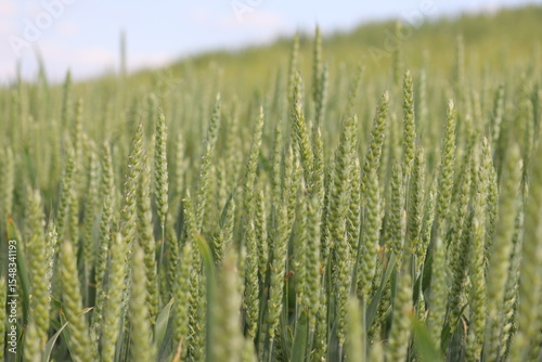 Green ears of unripe winter wheat in an agricultural field