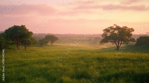 Green field, trees, misty dawn, background forest, possible advertising use