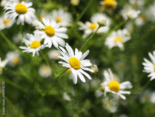 Green field with white daisy or chamomiles flowers