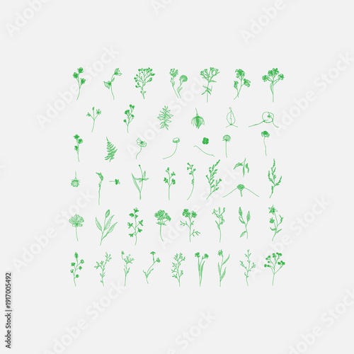 green floral background Collection of Hand-Drawn Floral Botanical Doodles in Green. Green Floral Graphic bundle collection Elements for Bullet Journaling and Notebook Design.