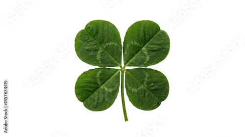 Green four leaf clover with visible veins and slight shadowing on the leaves in a close up transparent background and plain white background