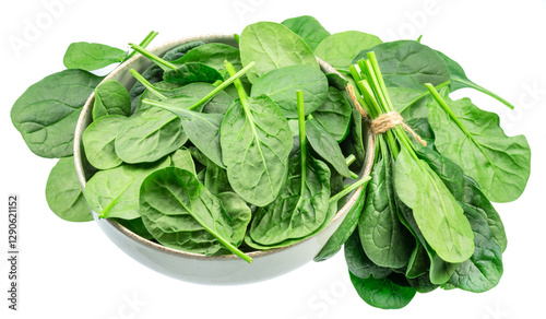 Green fresh spinach leaves in the bowl isolated on white background.