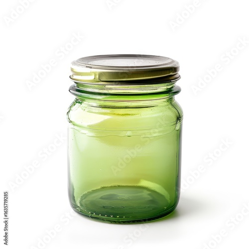 jar, glasses, green, metal, lid, empty, container, storage, food, preserve, kitchen, home, household, decoration, rustic, decorative, round, transparent, sealed, glassware, isolated, white, background, studio, product, object, simple, modern, vintage, clean, quality, functional, hard-wearing, recyclable, sustainable, eco, cardboard box, display, preserving