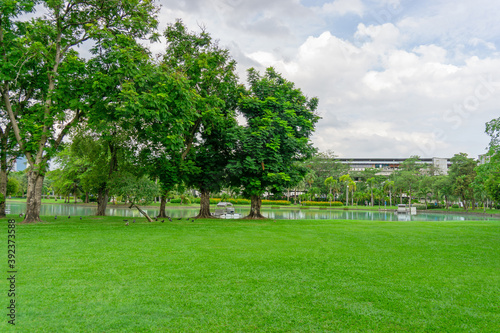 Green grass lawn and greenery trees on background in garden