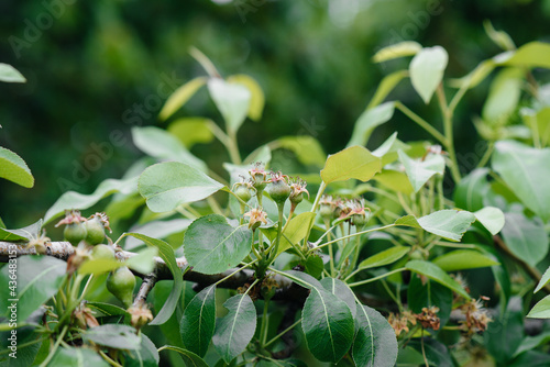 Green growing pears on the branches of trees close-up.