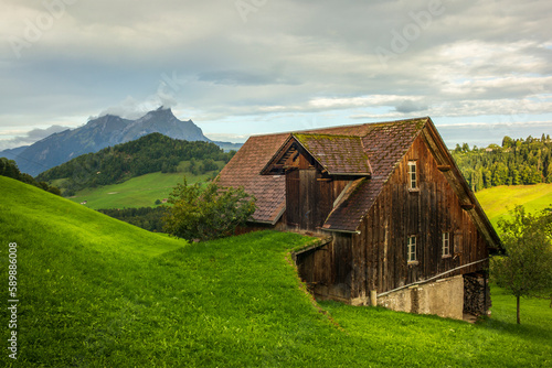 Green hills and farm buildings near the Buergenstock in the countryside of Lucerne in Switzerland