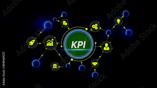 Green K P I circle with blue border and yellow business on black background key performance indicator