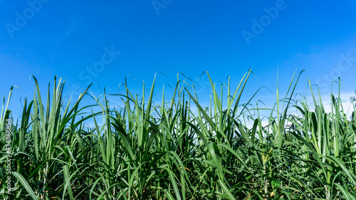 Green leaf of Sugarcane in agriculture planting field under blue sky
