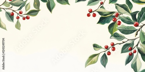 leaf, green, red, berry, tree branch, frame, border, background, illustration, watercolor, painting, art, design, nature, botanical, plant, floral, holiday, christmas, winter, festive, decoration, template, card, invitation, image, graphic, element, pattern, texture, seasonal, bright, vibrant, colours, contrast, space, blank, empty, copy