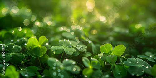 Green leaves with some shamrocks flying on top of the green with Swaying in Serenity Clover blurred defocused background at sunny day.