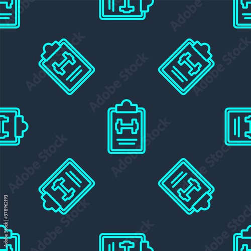 Green line Sport training program or fitness plan icon isolated seamless pattern on blue background. Vector.