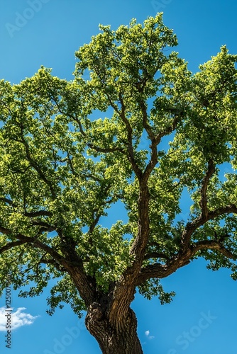 tree, nature, oak tree, green leaf, blue skies, summer, foliage, landscape, environment, plant, tree branch, sunlight, scenic view, wilderness, forest, seasonal, sunny day, springtime, timberland, botanical, park, shade, outdoors, greenery, scenic beauty, calmness, sustainable