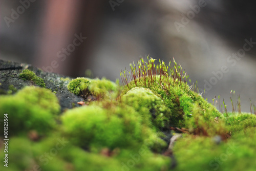 green moss on the tree at spring morning glows little macro world at the forest