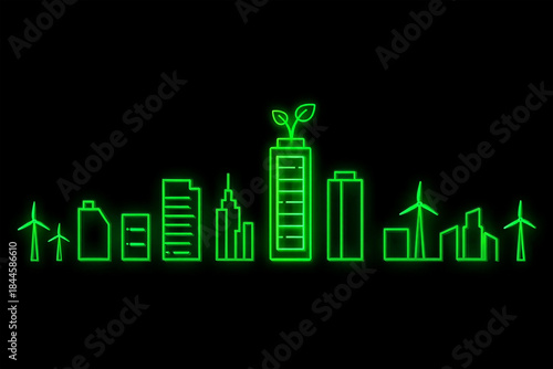 Green neon cityscape with wind turbines and battery building skyline buildings