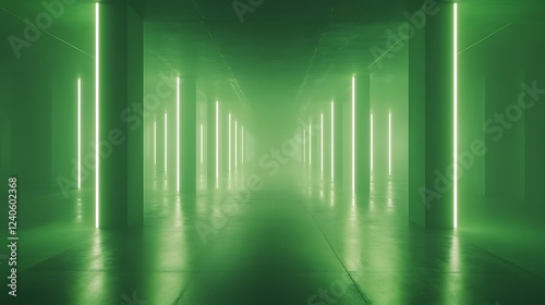 Green neon hallway, smoky atmosphere, futuristic background, abstract design