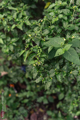 Green Nightshade Plant with Berries and Flowers