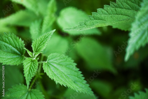 Green plant of common nettles in the ground with blur bokeh background.