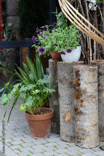 plant, nature, agriculture, garden, vegetable, spring, leaf, growth, organic, growing, grow, summer, grass, ground, herb, pot, gardening, flower, street, city, decor, decoration, town, outdoors, green, pot, plant, flower, potted, herb, flowerpot, wall, bloom, outside, blossom, flora, colours, wood, wooden, stump, container