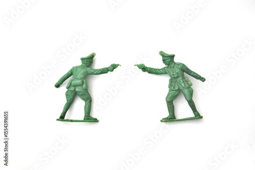 Green Plastic Toy Soldiers Duel on White Background, Childhood Nostalgia