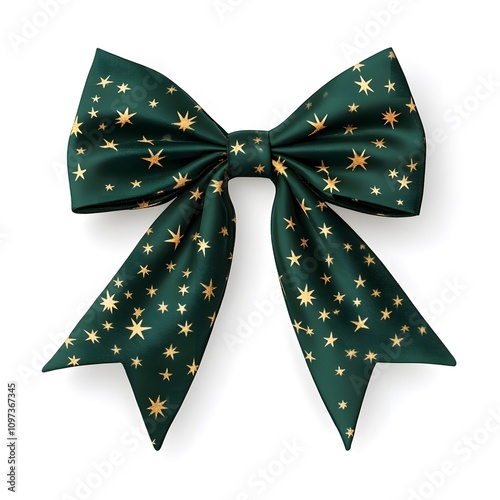 green, satin, bow, gold, star, pattern, festive, decoration, gift, wrapping, present, holiday, christmas, new, year, celebration, occasion, bow tie, ornament, accessory, elegant, luxurious, silky, shiny, glistering, sparkle, beautiful, stylish, graphic, design, isolated, white, background