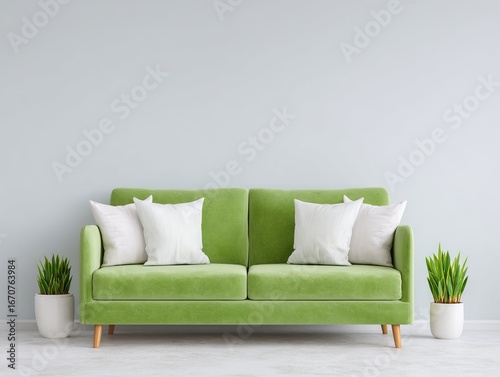 Green sofa with white cushions in minimalist room. Potted plants add natural touch to modern interior, perfect for home decor.