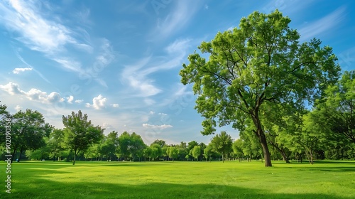 Green tree forest meadow field in city park blue sky Nature green scene background : Generative AI