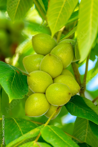 Green walnuts on a tree. A lot of nuts on a tree