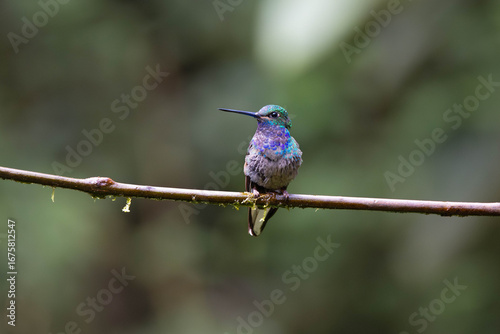 Green-backed Hillstar (Urochroa leucura) perched on a branch in Sumaco, Ecuador