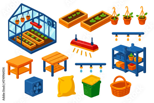 greenhouse, interior, isometric, vector, illustration, set, glasses, wall, metal, frame, raised, bed, hanging, pot, bench, table, grow, light, irrigation, pipe, storage, shelf, fan, unit, dirtied, sack, compost