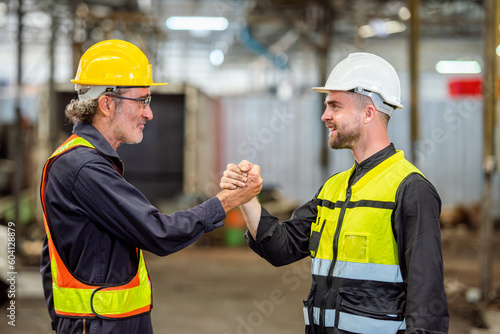 greeting by handshake touch fist and elbow of two engineer supervisor partnership in old factory. foreman greeting friend for good friendship colleague laborer in teamwork factory.