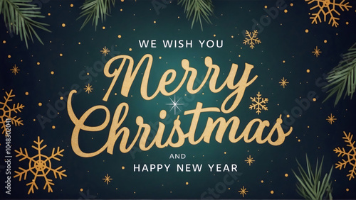 Greeting card with gold text wishing Merry Christmas and Happy New Year, set against a green pine background with golden snowflakes, dots and sparkling stars