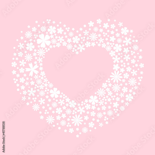 Greeting card with white flower heart frame for text. Pastel pink tender color.