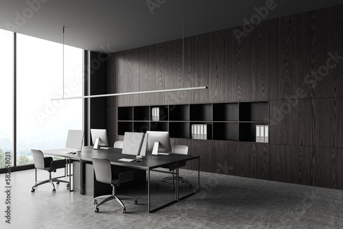 business, office, interior, three-dimensional, workplace, modern, design, room, shelf, window, work, corner, desk, computer, armchair, document, workspace, rendering, render, illustration, panoramic, countryside, half face, consulting, international, furniture, space, loft, table, finance, dark, wooden, wall, indoor, style, law, architecture, no people, desktop, technology, lamp, ceiling, dev, company, marketing, grey, concrete