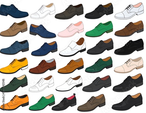 shoe, footwear, oxford, dress, leather, formal, fashion, style, collection, grid, diverse, colourful, blue, brown, green, pink, white, black, orange, elegant, polished, toe, heel, lace, pattern, arrangement, array, selection, clothes rack