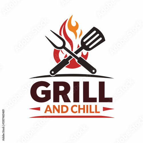 Grill And Chill Logo With Utensils And Fire Vector Design