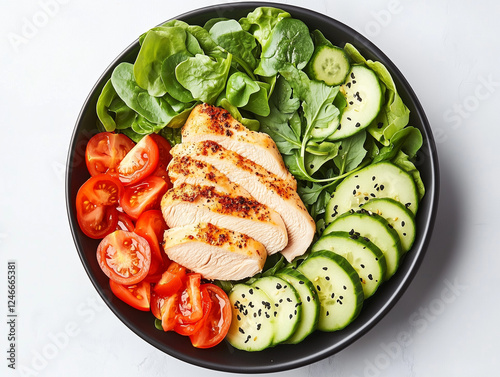 Grilled chicken breast, fillet and fresh vegetable salad of lettuce, arugula, spinach, cucumber and tomato.