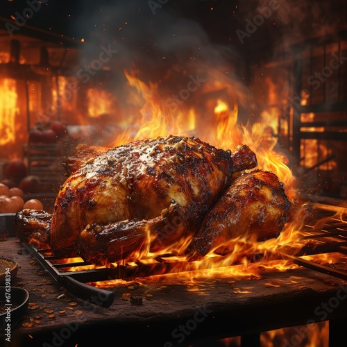 Grilled chicken on a barbecue grill with flames in the background, Ai Generated