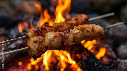 Grilled meat skewers over open flame